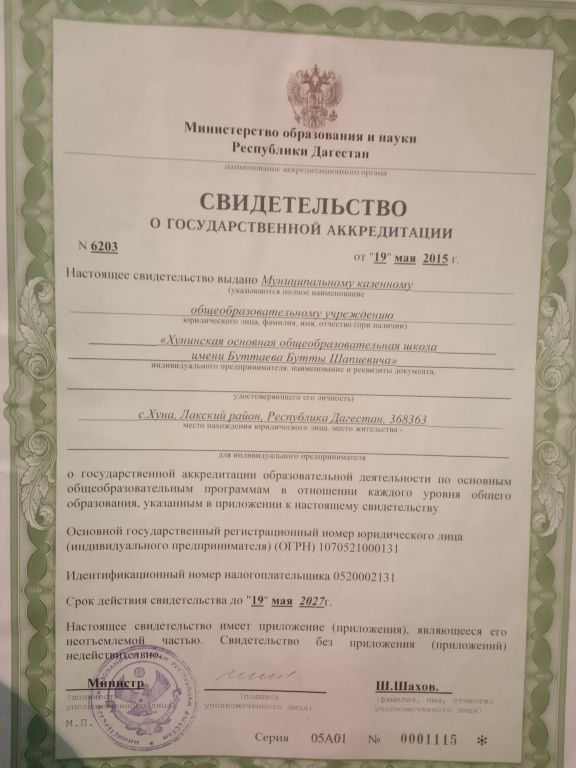 | Адрес местонахождения образовательной организации* | 368363 с.Хуна, Лакский район. Республика Дагестан РФ. |